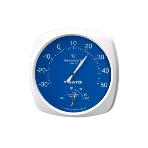 鮮やかなブルーの文字板に、白い目盛が良く映える壁掛け式の温湿度計です。